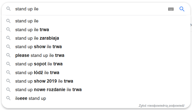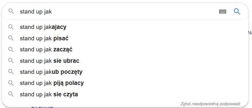 Mimo wszystko stwierdziłem, że pisząc ten tekst, podejmę wyzwanie. Przejrzałem automatyczne podpowiedzi wyszukiwarki na frazę „stand-up” i wybrałem te, które w różnych formach pojawiały się najczęściej. A później na nie odpowiedziałem, nie zwracając uwagi na stopień głupoty.