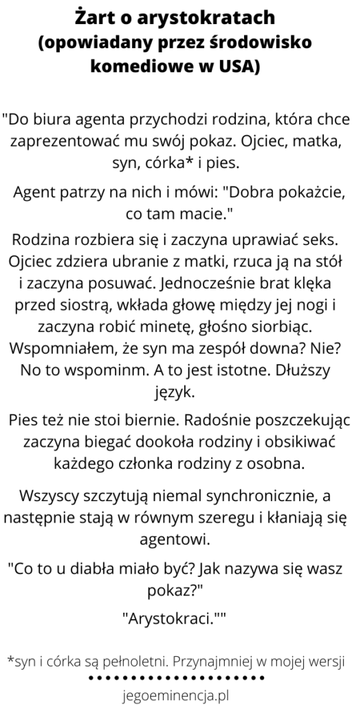 Wiem, że opowiadaniem Arystokratów zabawiali się między innymi Robin Williams i Bob Saget (co ciekawe obydwaj na co dzień brylowali w komediach familijnych). Żart pojawił się też w „Southparku”. Swoje korzenie ma jednak w wodewilu.