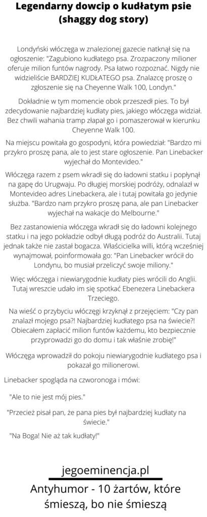 Mam na myśli „shaggy dog stories” – „historie kudłatego psa”. Są długie, ich fabuła meandruje w dziwnych kierunkach, a puenta zazwyczaj pozostawia mocny niedosyt.