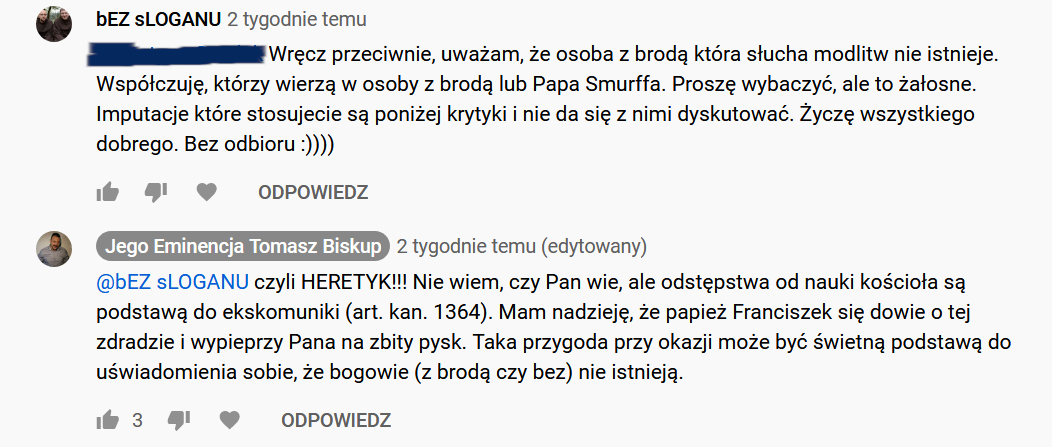 Przy okazji pod filmikiem rozgorzała dosyć ciekawa i zażarta dyskusja na tematy teologiczne.