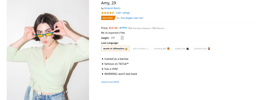 Jest to portal randkowy, na którym osoby są wystawione jak produkty. Możesz czytać recenzje i dodawać je do koszyka. Spokojnie! To są fałszywe osoby (prawdopodobnie).