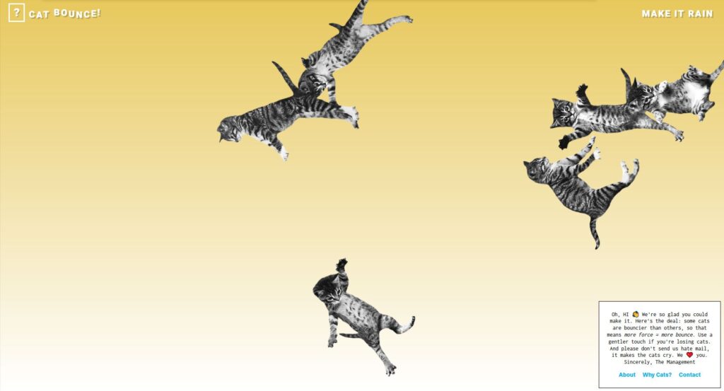 Witryna, na której odbijasz kotki to ten sam nurt, hmmm artystyczny. Odbijasz kursorem kotki. Surrealizm w wersji relaksującej.