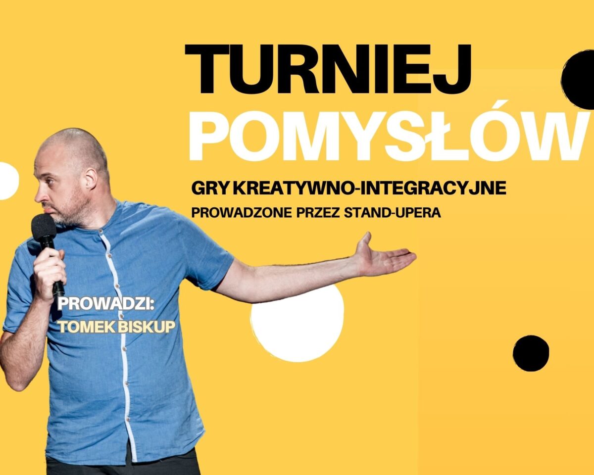 Turniej Pomysłów to program integracyjny oparty na kreatywności. Składa się z prostych gier, które zachęcają uczestników do wymyślania i szybkiego kojarzenia. Aktywności są zabawne, a co ważniejsze, w ich trakcie większa część humoru wychodzi od gości wydarzenia.